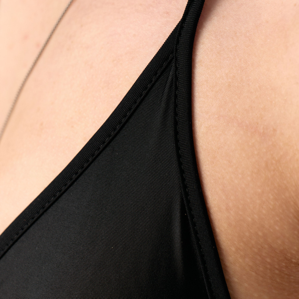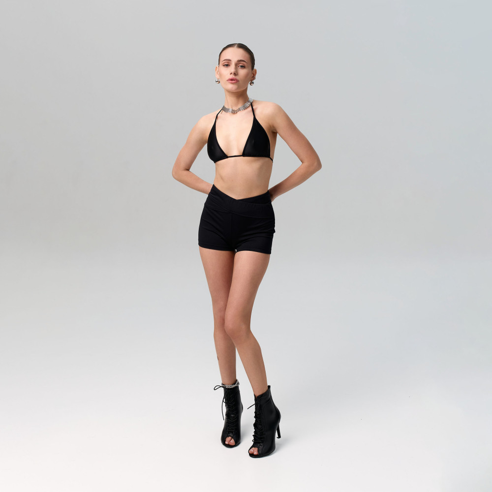 Black triangle top is made from smooth, elastic sports fabric that comfortably fits the body and does not restrict movement. The material combines the durability of nylon with the elasticity of spandex, allowing the top to stretch well and maintain its shape during active training and dance. The minimalist design provides comfort and freedom of movement.